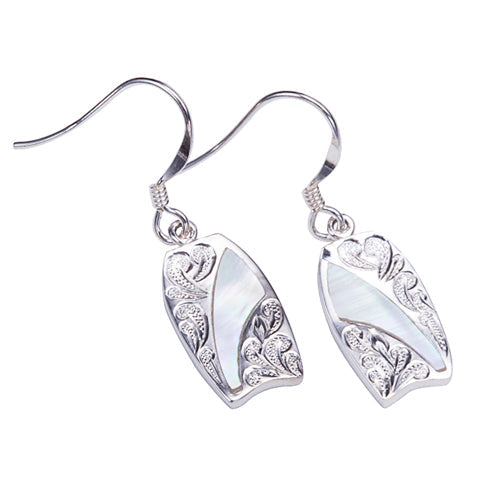 Sterling Silver Surfboard Hook Earring with Scrolling and Mother-of-Pearl Inlay