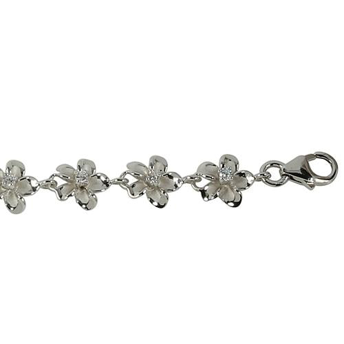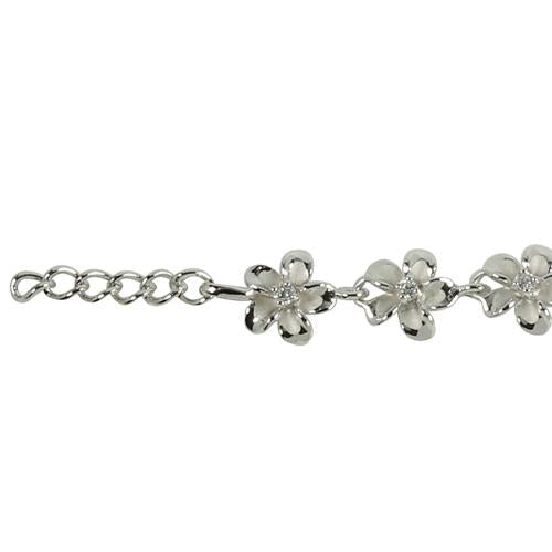 Solid 925 Sterling Silver Rhodium Plated Plumeria with CZ Prong Bracelet