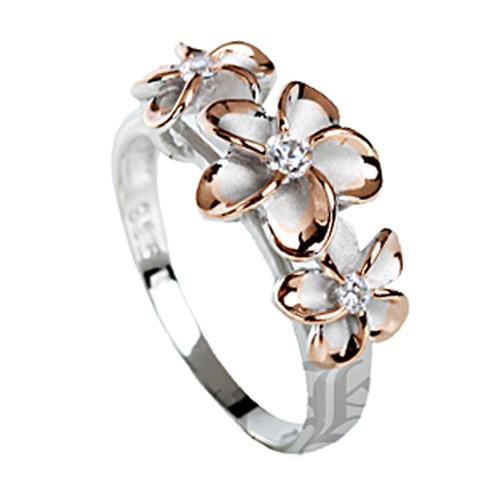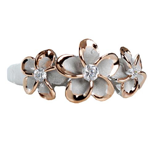 Sterling Silver Two-Tone Pink Gold and Rhodium Plated Three Plumeria with CZ Ring