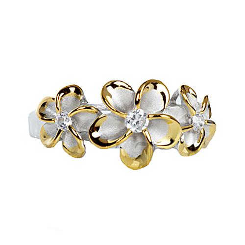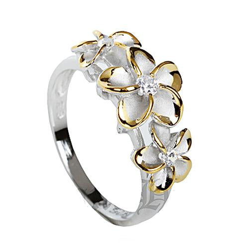 Sterling Silver Two-Tone Yellow Gold and Rhodium Plated Three Plumeria with CZ Ring