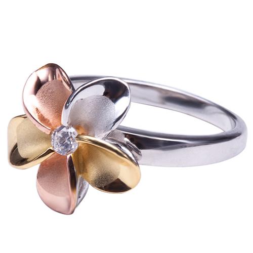 Sterling Silver Tri-Color 15mm Plumeria with CZ Ring