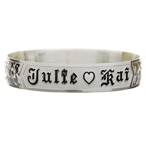 Sterling Silver Custom-Made Plumeria King Scroll Black Enamel Letter Smooth Edge Bangle (Heavy 1.75)