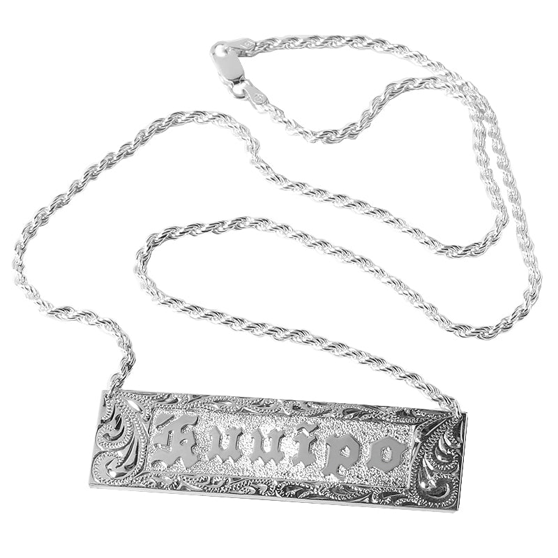 This beautiful necklace is made with 925 sterling silver with smooth edge finish. Hawaiian scroll with raise letter custom name.