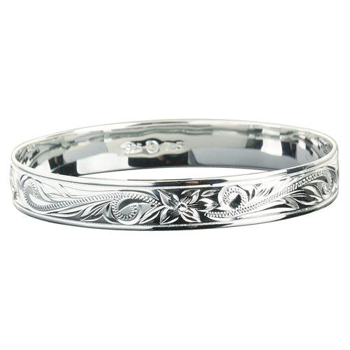 Sterling Silver Custom-Made Hawaiian Heirloom Bangle Plumeria King Scroll Raise Letter Smooth Edge (Heavy 1.75)