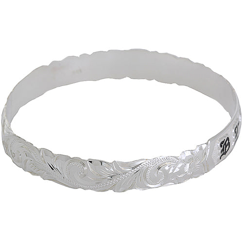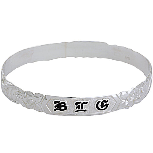 Sterling Silver Custom-Made Plumeria King Scroll Black Enamel Raise Letter Cut Out Edge Bangle (Heavy 1.75)