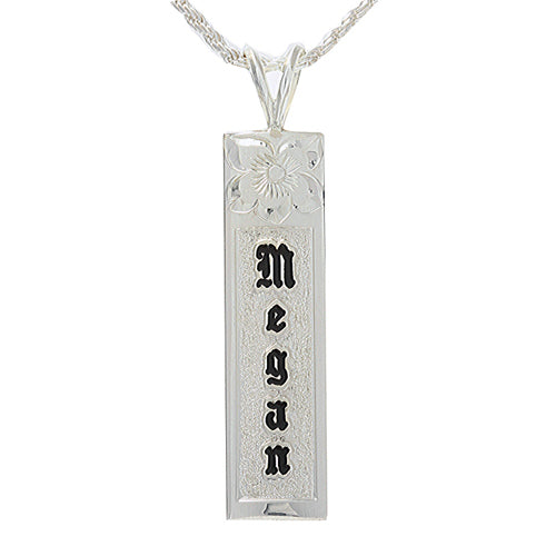 Sterling Silver Custom-Made Plumeria Black Enamel Raise Letter Smooth Edge Vertical Pendant
