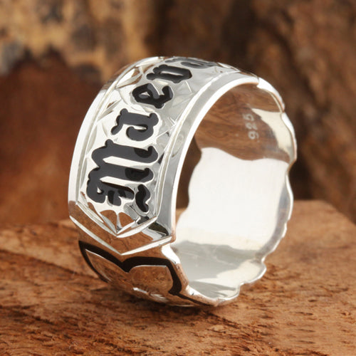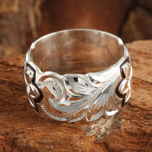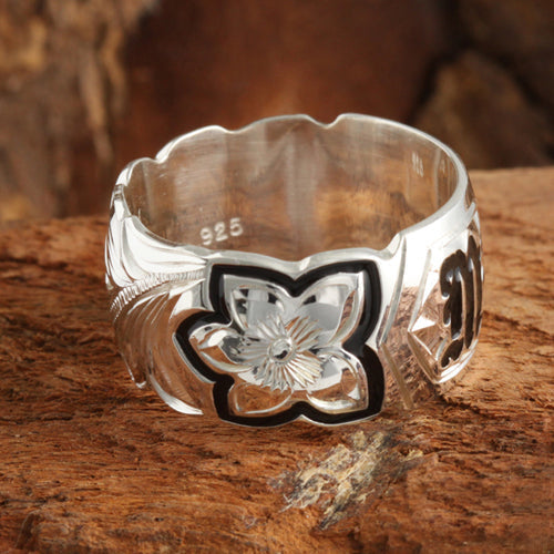 Sterling Silver Custom-Made Plumeria Scroll with Black Enamel Letter Cut Out Edge Ring (Heavy 1.75)