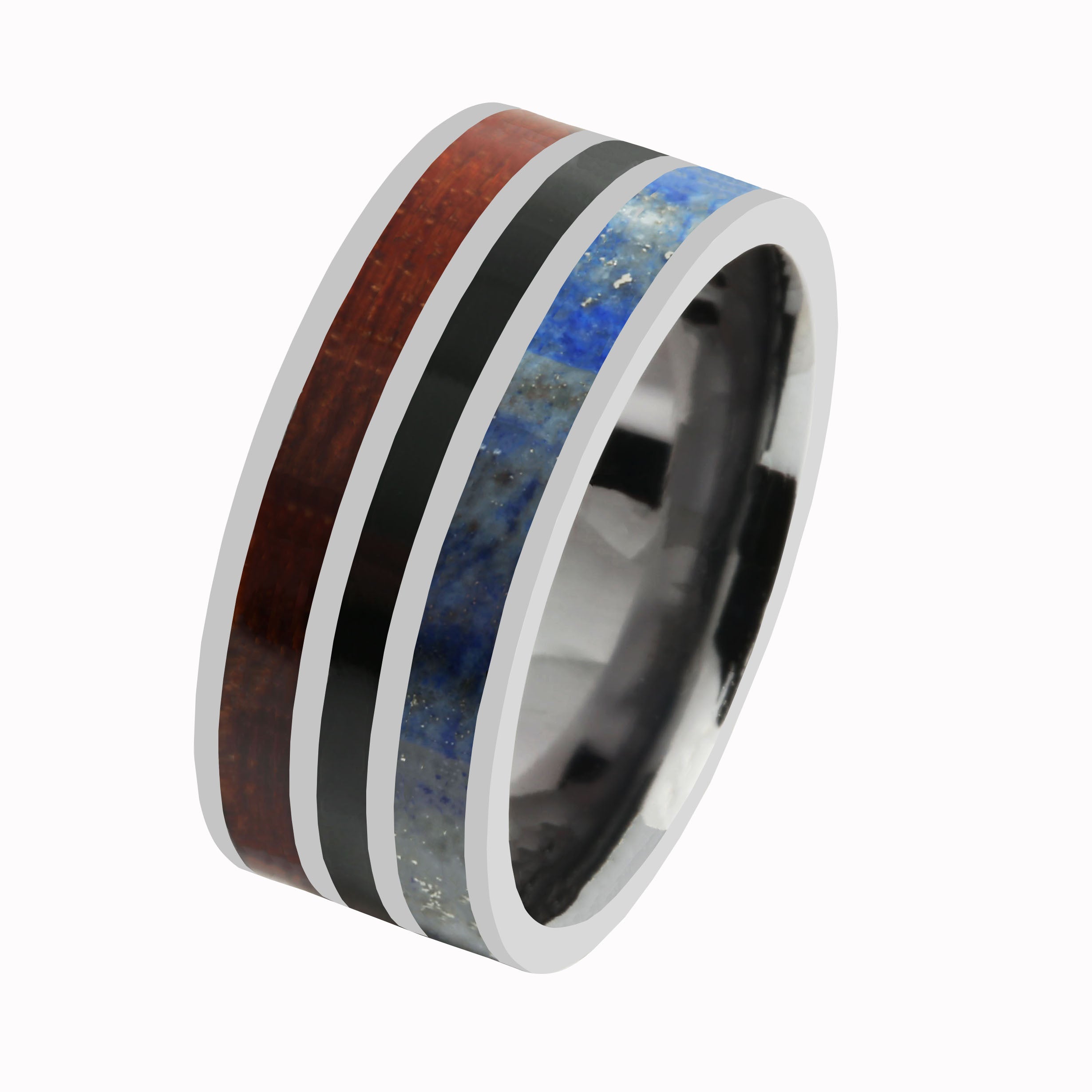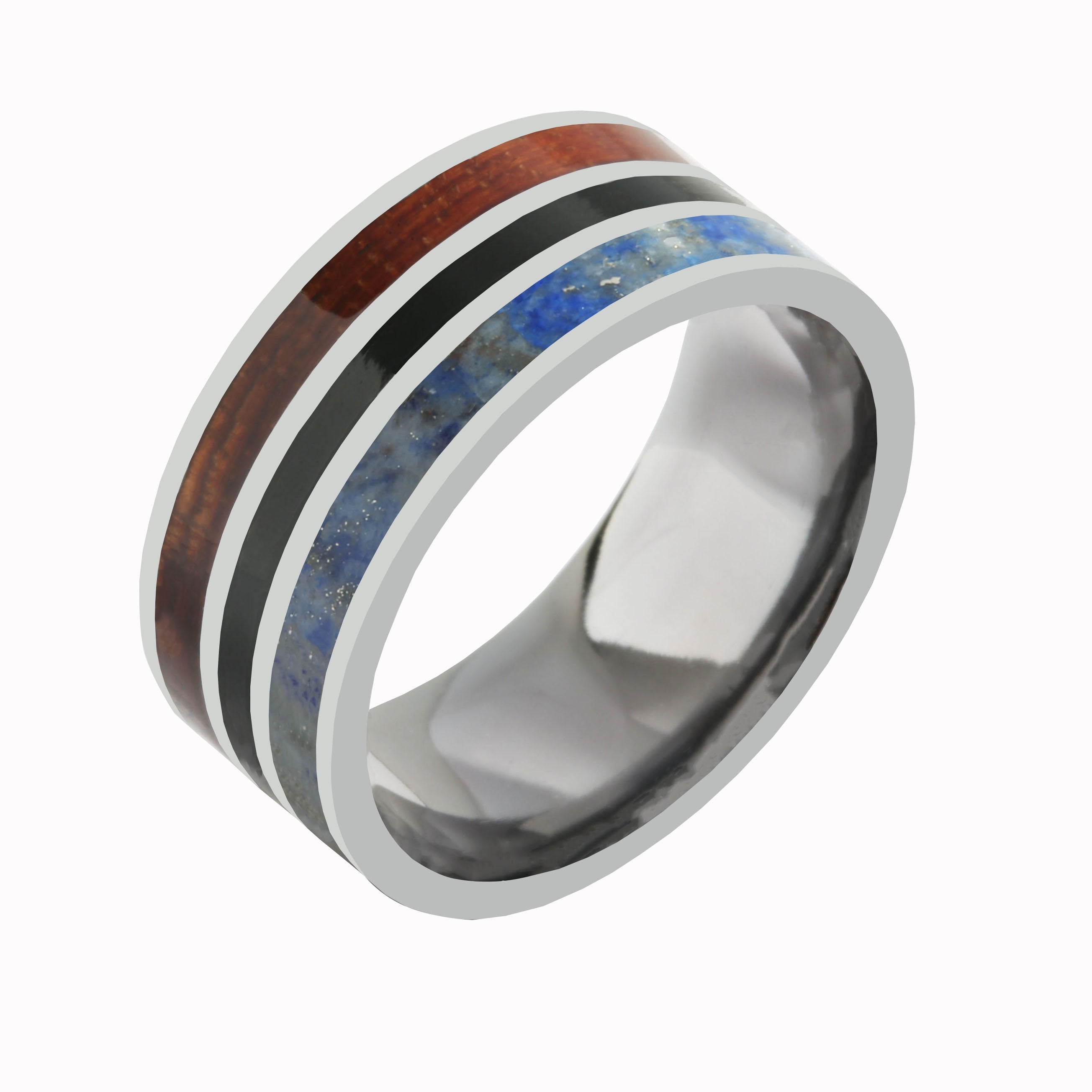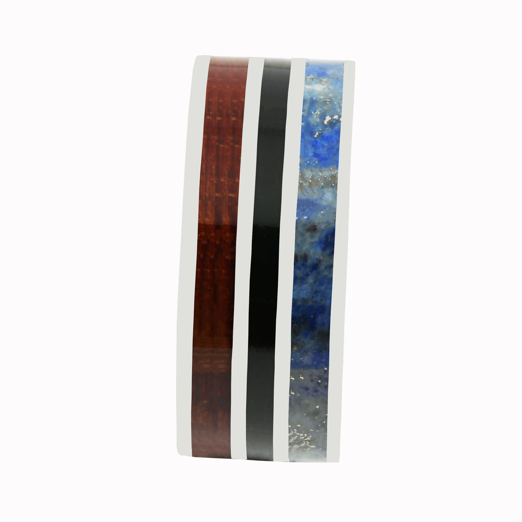 Tantalum with Koa Wood, Lapis Lazuli and Onyx Inlaid Wedding Ring Flat 10mm