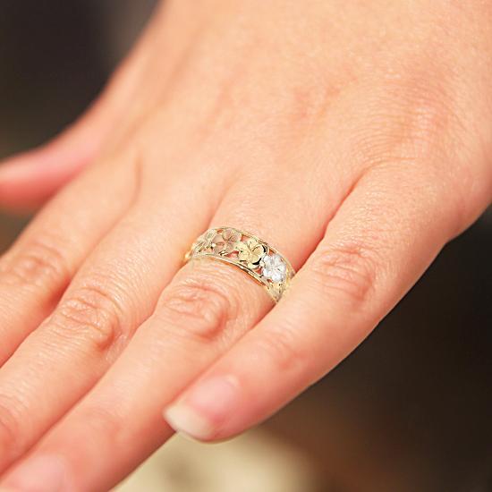 14K Tri-Color Gold See Through Plumeria Lei Ring Sandblast Polish Edge 7mm