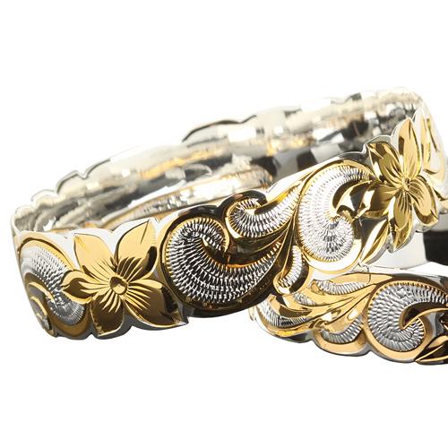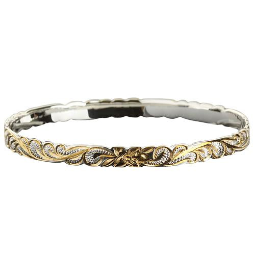 Hawaiian Sterling Silver Bangle Queen Scroll Engraving Cut Out Edge Yellow Gold Two Tone
