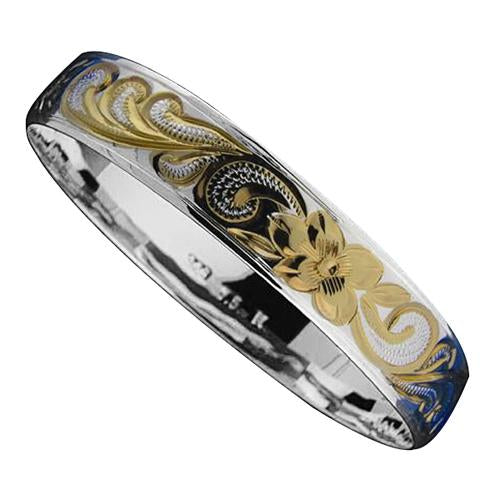 Hawaiian Sterling Silver Bangle Queen Scroll Engraving Straight Edge Yellow Gold Two Tone